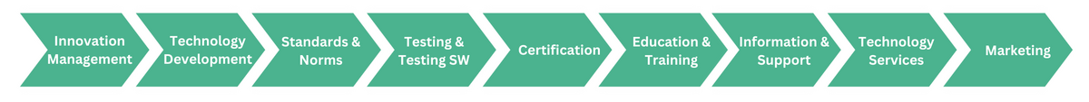 Certification is a central component that serves as proof of quality and trust. PI also offers comprehensive training courses, targeted information, consulting services, and a wide range of technology services. Finally, PI assists with marketing the developed solutions to ensure a successful market transition.